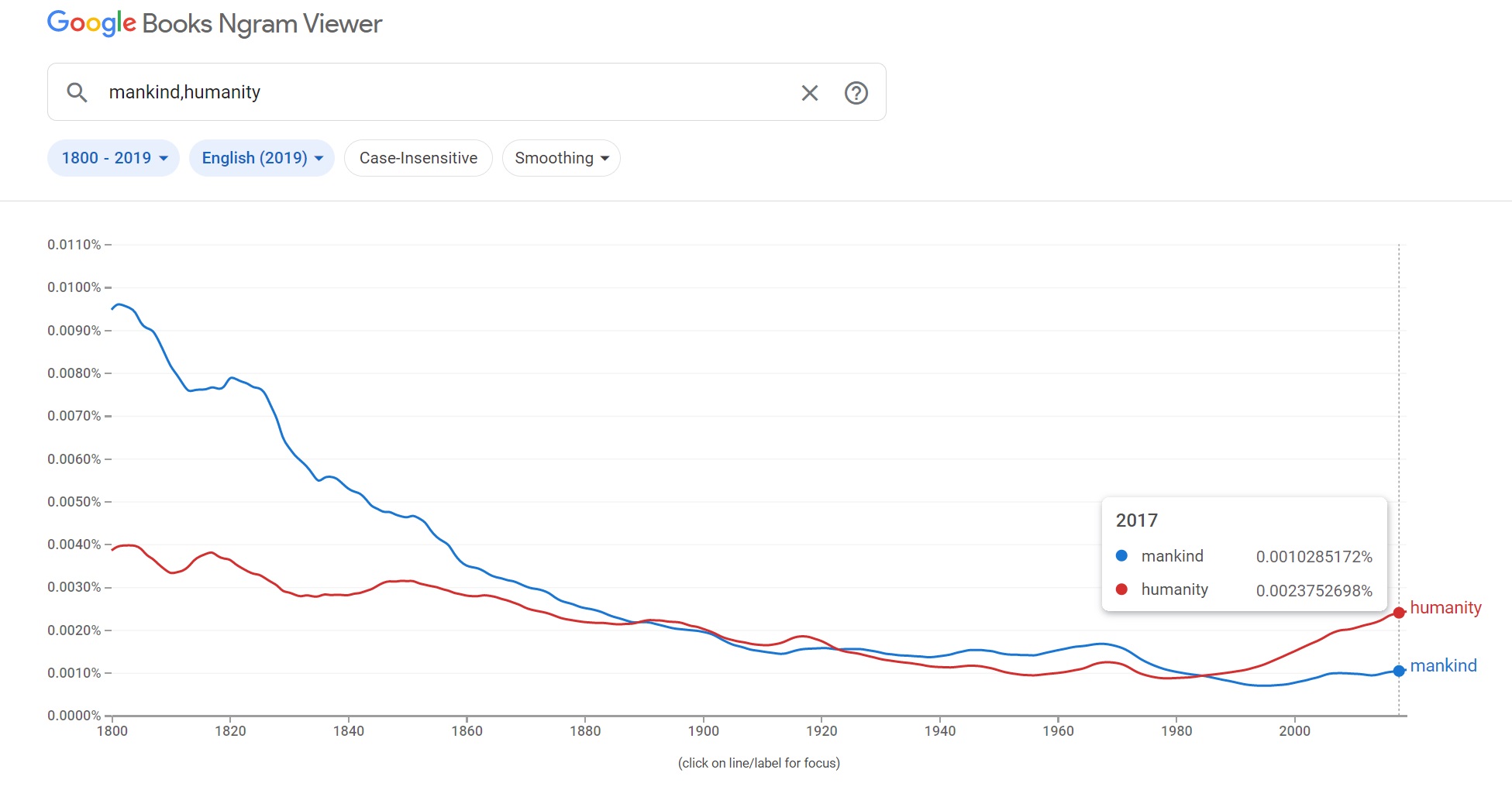 Google Ngram Viewer confirmed that the frequency use of humanity has risen significantly at 0.002409..% in comparing to 'mankind' at 0.001046..% in 2018.