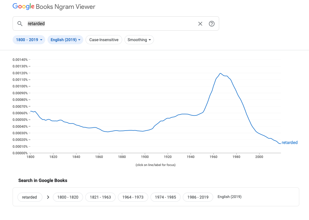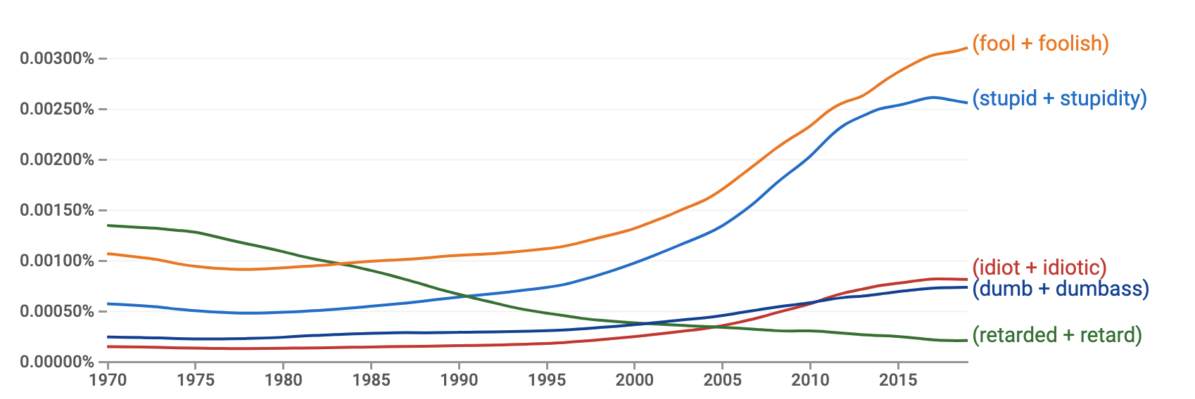 while retard+retarded is the only one that has dropped in use. So either we are being more PC, or we just have a lot more stupidity in the world....